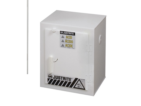 Solid polyethylene white acid cabinets have excellent chemical resistance to handle the most corrosive chemicals. A protective, all-welded bottom sump and a clean, sleek design complement any laboratory settings. Fully welded, liquid-tight 2″ (51-mm) sump contains accidental spills and makes clean up a snap. Door accepts a padlock for security. Research environments using many different types of chemicals have special storage requirements. Whether using acids, bases or solvents, it is critical that incompatible liquids are segregated to avoid disastrous explosions or fire. The SDS (Safety Data Sheet) should be reviewed to determine chemical characteristics and recommended storage practices.