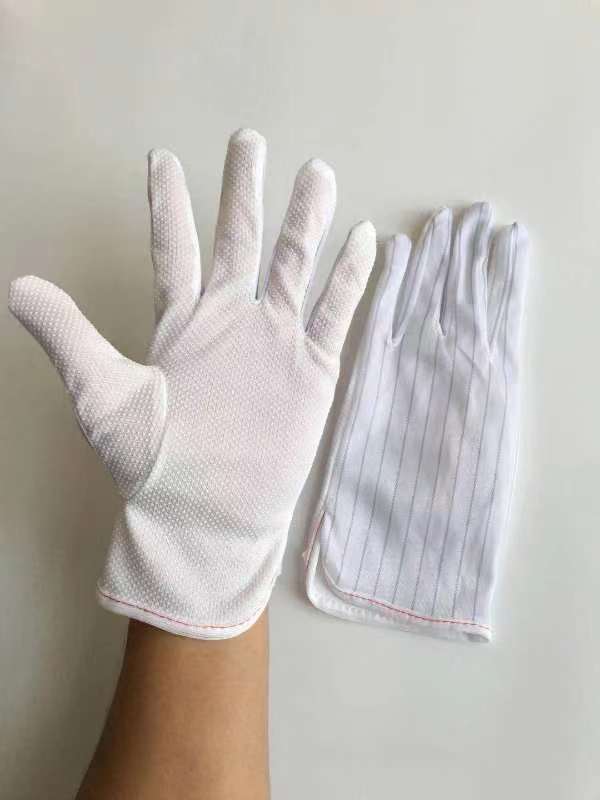 ESD (electrostatic discharge) PVC dotted gloves are gloves that are made of polyvinyl chloride (PVC) and have small dots on the surface of the gloves. These dots are made of a conductive material and are used to dissipate static electricity.