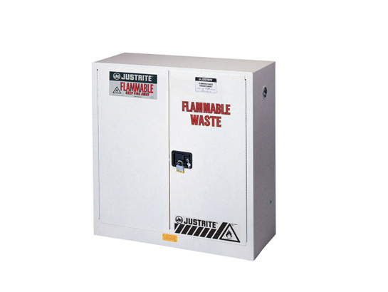 White Safety Cabinets for Flammable Waste are the solution for temporary collection and segregation of waste liquids. Large warning label “Flammable Waste” clearly identifies contents. Made to the same exacting standards as flammable safety cabinets, including double-wall construction, dual vents, grounding wire connections, adjustable shelves, leakproof sills, three-point self-latching doors and leveling feet. Manual-close doors open to a full 180 degrees and self-latch when pushed closed. Cabinets are FM approved and come with a ten-year warranty.