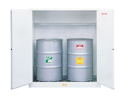 White Drum Cabinets for Flammable Waste are the solution for temporary on-site accumulation and storage of waste liquids. Vertical drum safety cabinets safely store waste awaiting pickup and disposal. Each cabinet includes a handy half-depth shelf for additional storage. Large warning label on outside doors identifies contents “Flammable Waste”. Manual-close doors open to a full 180 degrees and self-latch when pushed closed. Cabinets come with a ten-year warranty. For storage of larger quantities of flammable solvents, the heavy-duty Drum Safety Cabinet is available in many styles and sizes. Built to the same high standards as the smaller Classic Safety Cabinets, a reinforced liquid-tight sump contains spills. An array of drum accessories and equipment is available to ensure safety and convenience when storing and handling drums of hazardous materials.