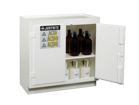 Solid polyethylene white acid cabinets have excellent chemical resistance to handle the most corrosive chemicals. A protective, all-welded bottom sump and a clean, sleek design complement any laboratory settings. Fully welded, liquid-tight 2″ (51-mm) sump contains accidental spills and makes clean up a snap. Shelf adjusts on 3″ (76-mm) center. Door accepts a padlock for security. Research environments using many different types of chemicals have special storage requirements. Whether using acids, bases or solvents, it is critical that incompatible liquids are segregated to avoid disastrous explosions or fire. The SDS (Safety Data Sheet) should be reviewed to determine chemical characteristics and recommended storage practices.
