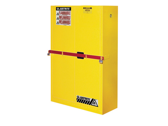 The High Security Safety Cabinet is ideal for use in high risk environments such as construction sites, correctional facilities, schools, maintenance areas, and nurseries/retail locations. In addition to all the Classic Cabinet features listed below the unique security system includes a high visibility steel barrier bar secured across both doors to deter prying. Padlock holes on crossbar and side bar channel are located on each side of the cabinet, provide double-layered steel strength and accept No. 5 Master Locks. Set of two keyed-alike locks are sold separately. Customarily, the yellow cabinet is used for flammables, the red is used for combustibles, the green is used for pesticides, and the blue is used for corrosives. Protect workers, reduce fire risks, and improve productivity by storing flammable fuels and chemicals in code-compliant safety cabinets. Designed to meet OSHA and NFPA standards, Sure-Grip® EX cabinets are constructed of sturdy 18-gauge (1-mm) thick double-wall, welded steel with 1-1/2” (38-mm) of insulating air space for fire resistance. High-performance, self-latching doors close easily and securely for maximum protection under fire conditions. Fail-safe closing mechanism ensures three-point stainless steel bullet latching system works every time. For added security, U-Loc™ handle comes with a cylinder lock and key set or accepts an optional padlock. Haz-Alert™ reflective warning labels are highly visible under fire conditions or during power outages when illuminated with a flashlight. Patented SpillSlope® galvanized steel shelves direct spills to back and bottom of a leakproof 2” (51-mm) bottom sump. They adjust on 3” (76-mm) centers for versatile storage. Cabinets also feature dual vents with flame arresters, four adjustable self-leveling feet, grounding connector, and trilingual warning label. Durable lead-free epoxy/polyester powder-coat finish provides excellent chemical resistance. Manual-close door(s) opens to a full 180 degrees and self-latches when pushed closed. Self-close door(s) shuts and latches automatically when a fusible link melts at 165°F (74ºC) under fire conditions. Unique, concealed self-closing mechanism offers obstruction-free access to contents. All door styles meet OSHA and NFPA 30; self-close door styles also meet NFPA 1 and the International Fire Code. Most cabinets are FM approved and all come with a ten-year warranty.