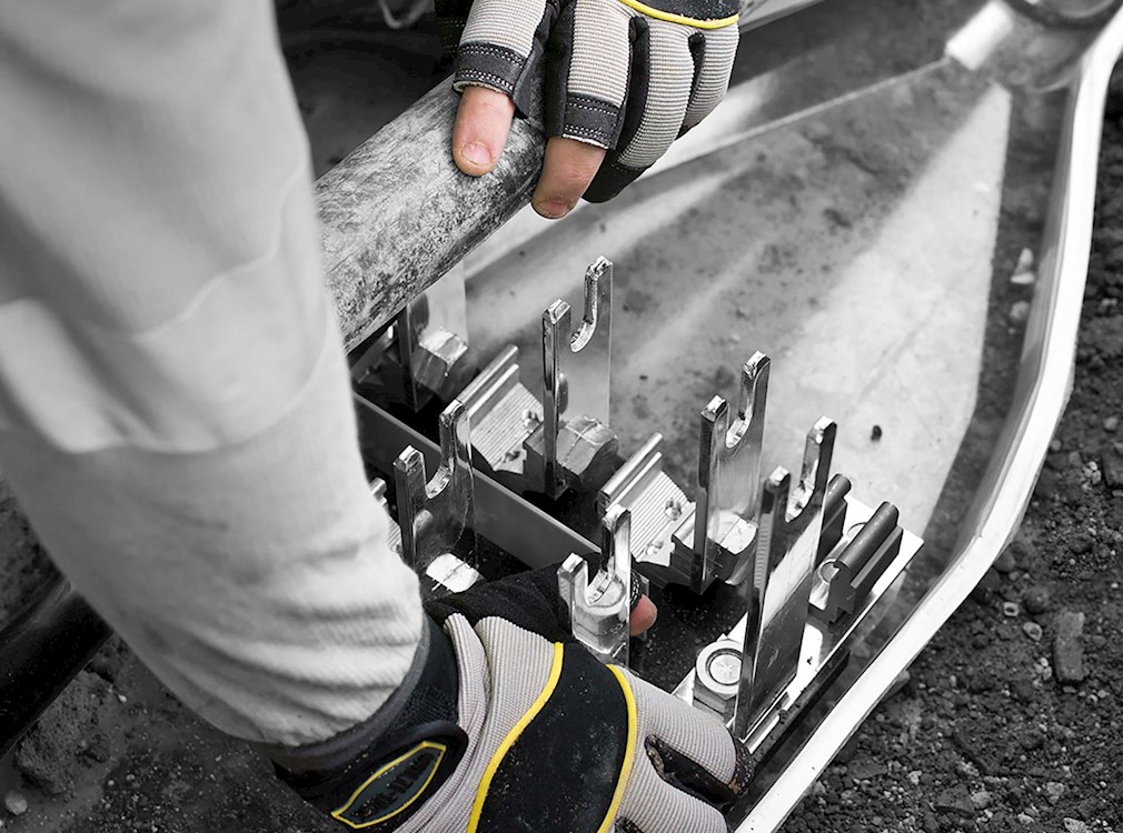 Blend of synthetic leathers with PVC reinforced fingertips and inner palm, and three open fingers