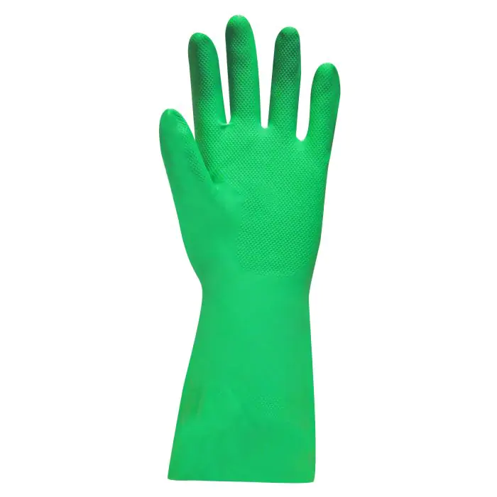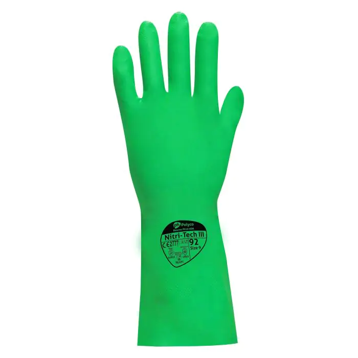 Crafted from high-quality Nitrile synthetic rubber, these Nitri-Tech III Green Flock Lined 33cm Nitrile Rubber Gloves offer top-tier chemical resistance, achieving type A chemical resistance as outlined by EN374-1. Safeguarding against an extensive range of chemicals and cleaning agents, they are your ultimate defense in diverse industrial settings.