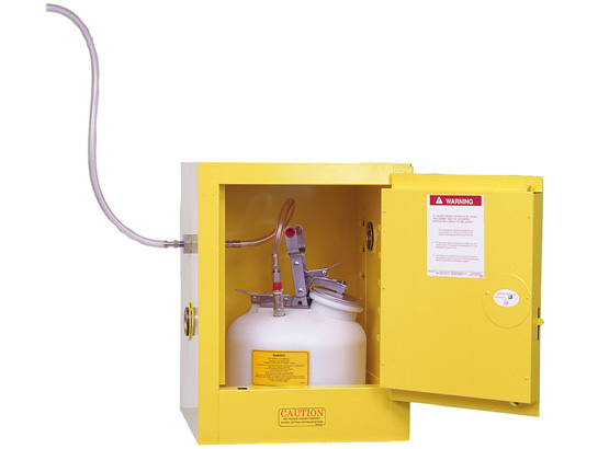 Protect workers, reduce fire risks, and improve productivity by storing flammable fuels and chemicals in code-compliant safety cabinets. Designed to meet OSHA and NFPA standards, Sure-Grip® EX cabinets are constructed of sturdy 18-gauge (1-mm) thick double-wall, welded steel with 1-1/2” (38-mm) of insulating air space for fire resistance. High-performance, self-latching doors close easily and securely for maximum protection under fire conditions. Fail-safe closing mechanism ensures three-point stainless steel bullet latching system works every time. For added security, U-Loc™ handle comes with a cylinder lock and key set or accepts an optional padlock. Haz-Alert™ reflective warning labels are highly visible under fire conditions or during power outages when illuminated with a flashlight. Patented SpillSlope® galvanized steel shelves direct spills to back and bottom of a leakproof 2” (51-mm) bottom sump. They adjust on 3” (76-mm) centers for versatile storage. Cabinets also feature dual vents with flame arresters, four adjustable self-leveling feet, grounding connector, and trilingual warning label. Durable lead-free epoxy/polyester powder-coat finish provides excellent chemical resistance. All cabinets are FM approved and come with a ten-year warranty. Self-closing models also meet NFPA1 and the International Fire Code. They shut and latch automatically when a fusible link melts at 165°F (74ºC) under fire conditions. Unique, concealed self-closing mechanism offers obstruction-free access to contents. – See more at: http://justrite.wsoldev.com/Products/Safety-Cabinets-and-Containers/Safety-Cabinets-for-Flammables/Transportable-Mini-Countertop-and-Compact-Cabinets/890200/?id=459_1157&epiworkspaceactive=true&visitorgroupsByID=#sthash.lEs2slYg.dpuf Pass-through Valve can be used on the sides or back of any safety cabinet. Unique system provides a means to pass solvent through the wall of a cabinet, making it possible to pump liquid into and/or out of the cabinet without human hand transfer. Stainless steel valve is one way and cannot be reversed. A 1/4″ NPT (tapered) fitting is required to thread into both sides of the valve. FM approved.