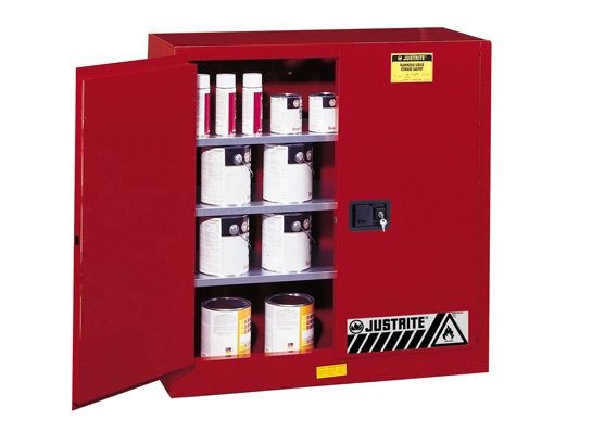 Easily separate and identify Class III combustibles using these red safety cabinets. Adjustable shelves accommodate many smaller paint tins, aerosols and inks found in printing, painting, furniture and motor vehicle operations. Sure-Grip® EX combustibles storage cabinets have all the same quality features as Justrite’s flammable cabinets as outlined below. Designed to meet OSHA and NFPA standards, Sure-Grip® EX cabinets are constructed of sturdy 18-gauge (1-mm) thick double-wall, welded steel with 1-1/2 in. (38-mm) of insulating air space for fire resistance. High-performance, self-latching doors close easily and securely for maximum protection under fire conditions. Fail-safe closing mechanism ensures three-point stainless steel bullet latching system works every time. For added security, U-Loc™ handle comes with a cylinder lock and key set or accepts an optional padlock. Haz-Alert™ reflective warning labels are highly visible under fire conditions or during power outages when illuminated with a flashlight. Patented SpillSlope® galvanized steel shelves direct spills to back and bottom of a leakproof sump. They adjust on 3 in. (76-mm) centers for versatile storage. Cabinets also feature a leakproof 2 in. (51-mm) bottom sump, dual vents with flame arresters, four adjustable self-leveling feet, grounding connector and trilingual warning label. Durable lead-free epoxy/polyester powder-coat finish provides excellent chemical resistance. Manual-close door(s) opens to a full 180 degrees and self-latches when pushed closed. Self-close door(s) shuts and latches automatically when a fusible link melts at 165°F (74ºC) under fire conditions. Unique, concealed self-closing mechanism offers obstruction-free access to contents. All door styles meet OSHA and NFPA 30; self-close door styles also meet NFPA 1 and the International Fire Code. All cabinets are FM approved and come with a ten-year warranty.