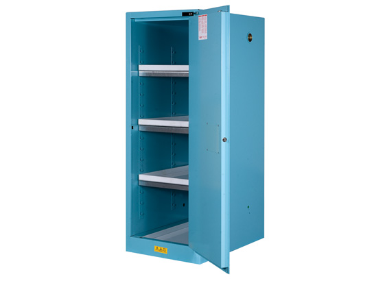 Justrite blue steel Deep Slimline safety cabinets for corrosives have the same quality safety features as the cabinets for flammables. All models come with double-wall construction, dual vents, grounding wire connections, adjustable shelves, leakproof sills, three-point self-latching doors and leveling feet. Self-close door(s) shuts and latches automatically when a fusible link melts at 165°F (74ºC) under fire conditions. Unique, concealed self-closing mechanism offers obstruction-free access to contents. Additionally, they include polyethylene trays attached to galvanized steel shelves and a separate polyethylene liner for the bottom sump resist aggressive chemicals. Easily remove the liner for quick cleaning of drips and leaks. An all epoxy baked-on powder-coat finish, inside and out, provides increased chemical resistance. Self Close models meet OSHA, NFPA 30, NFPA 1 and the International Fire Code. Cabinets are FM approved and come with a ten-year warranty. Research environments using many different types of chemicals have special storage requirements. Whether using acids, bases or solvents, it is critical that incompatible liquids are segregated to avoid disastrous explosions or fire. The SDS (Safety Data Sheet) should be reviewed to determine chemical characteristics and recommended storage practices.