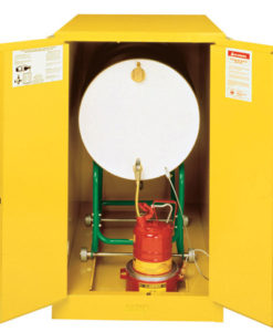 Safely house horizontal drums for use in gravity-flow dispensing applications. The interior provides space for a drip-can and includes tracks to guide drum cradle (sold separately below) into position. Manual-close doors open to a full 180 degrees and self-latch when pushed closed. Cabinets are FM approved and come with a ten-year warranty. For storage of larger quantities of flammable solvents, the heavy-duty Drum Safety Cabinet is available in many styles and sizes. Built to the same high standards as the smaller Classic Safety Cabinets, a reinforced liquid-tight sump contains spills. An array of drum accessories and equipment is available to ensure safety and convenience when storing and handling drums of hazardous materials.