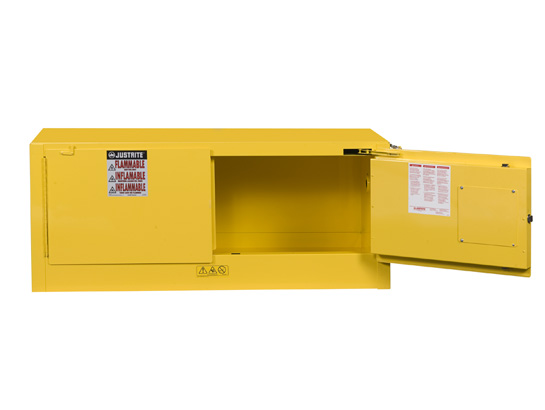 Protect workers, reduce fire risks, and improve productivity by storing flammable fuels and chemicals in code-compliant safety cabinets. Designed to meet OSHA and NFPA standards, Sure-Grip® EX cabinets are constructed of sturdy 18-gauge (1-mm) thick double-wall, welded steel with 1-1/2” (38-mm) of insulating air space for fire resistance. High-performance, self-latching doors close easily and securely for maximum protection under fire conditions. Fail-safe closing mechanism ensures three-point stainless steel bullet latching system works every time. For added security, U-Loc™ handle comes with a cylinder lock and key set or accepts an optional padlock. Haz-Alert™ reflective warning labels are highly visible under fire conditions or during power outages when illuminated with a flashlight. Patented SpillSlope® galvanized steel shelves direct spills to back and bottom of a leakproof 2” (51-mm) bottom sump. They adjust on 3” (76-mm) centers for versatile storage. Cabinets also feature dual vents with flame arresters, four adjustable self-leveling feet, grounding connector, and trilingual warning label. Durable lead-free epoxy/polyester powder-coat finish provides excellent chemical resistance. All cabinets are FM approved and come with a ten-year warranty. Self-closing models also meet NFPA1 and the International Fire Code. They shut and latch automatically when a fusible link melts at 165°F (74ºC) under fire conditions. Unique, concealed self-closing mechanism offers obstruction-free access to contents. – See more at: http://justrite.wsoldev.com/Products/Safety-Cabinets-and-Containers/Safety-Cabinets-for-Flammables/Transportable-Mini-Countertop-and-Compact-Cabinets/890200/?id=459_1157&epiworkspaceactive=true&visitorgroupsByID=#sthash.lEs2slYg.dpuf Create a safe storage for flammables without taking up valuable floor space. Designed to mount on top of 30- and 45-gallon (114- and 170-L), manual or self-closing Sure-Grip® EX cabinets. They can also be used independently as a benchtop cabinet or stacked to provide additional storage. Turn it into a wall-mount cabinet with by ordering a wall hanger assembly 25950. These cabinets have all the great features and benefits of our classic cabinets as outlined below. Protect workers, reduce fire risks, and improve productivity by storing flammable fuels and chemicals in code-compliant safety cabinets. Designed to meet OSHA and NFPA standards, Sure-Grip® EX cabinets are constructed of sturdy 18-gauge (1-mm) thick double-wall, welded steel with 1-1/2” (38-mm) of insulating air space for fire resistance. High-performance, self-latching doors close easily and securely for maximum protection under fire conditions. Fail-safe closing mechanism ensures three-point stainless steel bullet latching system works every time. For added security, U-Loc™ handle comes with a cylinder lock and key set or accepts an optional padlock. Haz-Alert™ reflective warning labels are highly visible under fire conditions or during power outages when illuminated with a flashlight. Cabinets also feature dual vents with flame arresters, four adjustable self-leveling feet, grounding connector, and trilingual warning label. Durable lead-free epoxy/polyester powder-coat finish provides excellent chemical resistance. All cabinets are FM approved and come with a ten-year warranty. Manual-close door(s) opens to a full 180 degrees and self-latches when pushed closed. Self-close door(s) shuts and latches automatically when a fusible link melts at 165°F (74ºC) under fire conditions. Unique, concealed self-closing mechanism offers obstruction-free access to contents. All door styles meet OSHA and NFPA 30; self-close door styles also meet NFPA 1 and the International Fire Code. Protect workers, reduce fire risks, and improve productivity by storing flammable fuels and chemicals in code-compliant safety cabinets. Designed to meet OSHA and NFPA standards, Sure-Grip® EX cabinets are constructed of sturdy 18-gauge (1-mm) thick double-wall, welded steel with 1-1/2” (38-mm) of insulating air space for fire resistance. High-performance, self-latching doors close easily and securely for maximum protection under fire conditions. Fail-safe closing mechanism ensures three-point stainless steel bullet latching system works every time. For added security, U-Loc™ handle comes with a cylinder lock and key set or accepts an optional padlock. Haz-Alert™ reflective warning labels are highly visible under fire conditions or during power outages when illuminated with a flashlight. Patented SpillSlope® galvanized steel shelves direct spills to back and bottom of a leakproof 2” (51-mm) bottom sump. They adjust on 3” (76-mm) centers for versatile storage. Cabinets also feature dual vents with flame arresters, four adjustable self-leveling feet, grounding connector, and trilingual warning label. Durable lead-free epoxy/polyester powder-coat finish provides excellent chemical resistance. Manual-close door(s) opens to a full 180 degrees and self-latches when pushed closed. Self-close door(s) shuts and latches automatically when a fusible link melts at 165°F (74ºC) under fire conditions. Unique, concealed self-closing mechanism offers obstruction-free access to contents. All door styles meet OSHA and NFPA 30; self-close door styles also meet NFPA 1 and the International Fire Code. Most cabinets are FM approved and all come with a ten-year warranty.