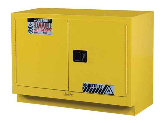 Under Fume Hood Cabinets are fully compliant and designed for the safe storage and venting of solvents and flammable liquids. Ideal in laboratories under fume hoods, benches, or counters, these cabinets are available in four widths ranging from 24″ (610mm) to 48″ (1219mm). Single-door cabinets are offered in either left or right-hinge door closures for easy operation where space is at a premium. Back wall vents with built-in flame arresters are positioned at lower left and top right for jurisdictions that mandate venting of vapors. In addition, they have all the great features and benefits of our classic cabinets as outlined below. Protect workers, reduce fire risks, and improve productivity by storing flammable fuels and chemicals in code-compliant safety cabinets. Designed to meet OSHA and NFPA standards, Sure-Grip® EX cabinets are constructed of sturdy 18-gauge (1-mm) thick double-wall, welded steel with 1-1/2” (38-mm) of insulating air space for fire resistance. High-performance, self-latching doors close easily and securely for maximum protection under fire conditions. Fail-safe closing mechanism ensures three-point stainless steel bullet latching system works every time. For added security, U-Loc™ handle comes with a cylinder lock and key set or accepts an optional padlock. Haz-Alert™ reflective warning labels are highly visible under fire conditions or during power outages when illuminated with a flashlight. Patented SpillSlope® galvanized steel shelves direct spills to back and bottom of a leakproof 2” (51-mm) bottom sump. They adjust on 3” (76-mm) centers for versatile storage. Cabinets also feature dual vents with flame arresters, four adjustable self-leveling feet, grounding connector, and trilingual warning label. Durable lead-free epoxy/polyester powder-coat finish provides excellent chemical resistance. Manual-close door(s) opens to a full 180 degrees and self-latches when pushed closed. Self-close door(s) shuts and latches automatically when a fusible link melts at 165°F (74ºC) under fire conditions. Unique, concealed self-closing mechanism offers obstruction-free access to contents. All door styles meet OSHA and NFPA 30; self-close door styles also meet NFPA 1 and the International Fire Code. Most cabinets are FM approved and all come with a ten-year warranty.